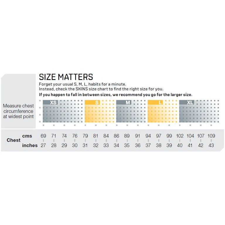 To maximize the effect of compression, it is important to wear SKINS in the correct size. That’s why you will find a size chart with the pictures, which will tell you the right size for you.